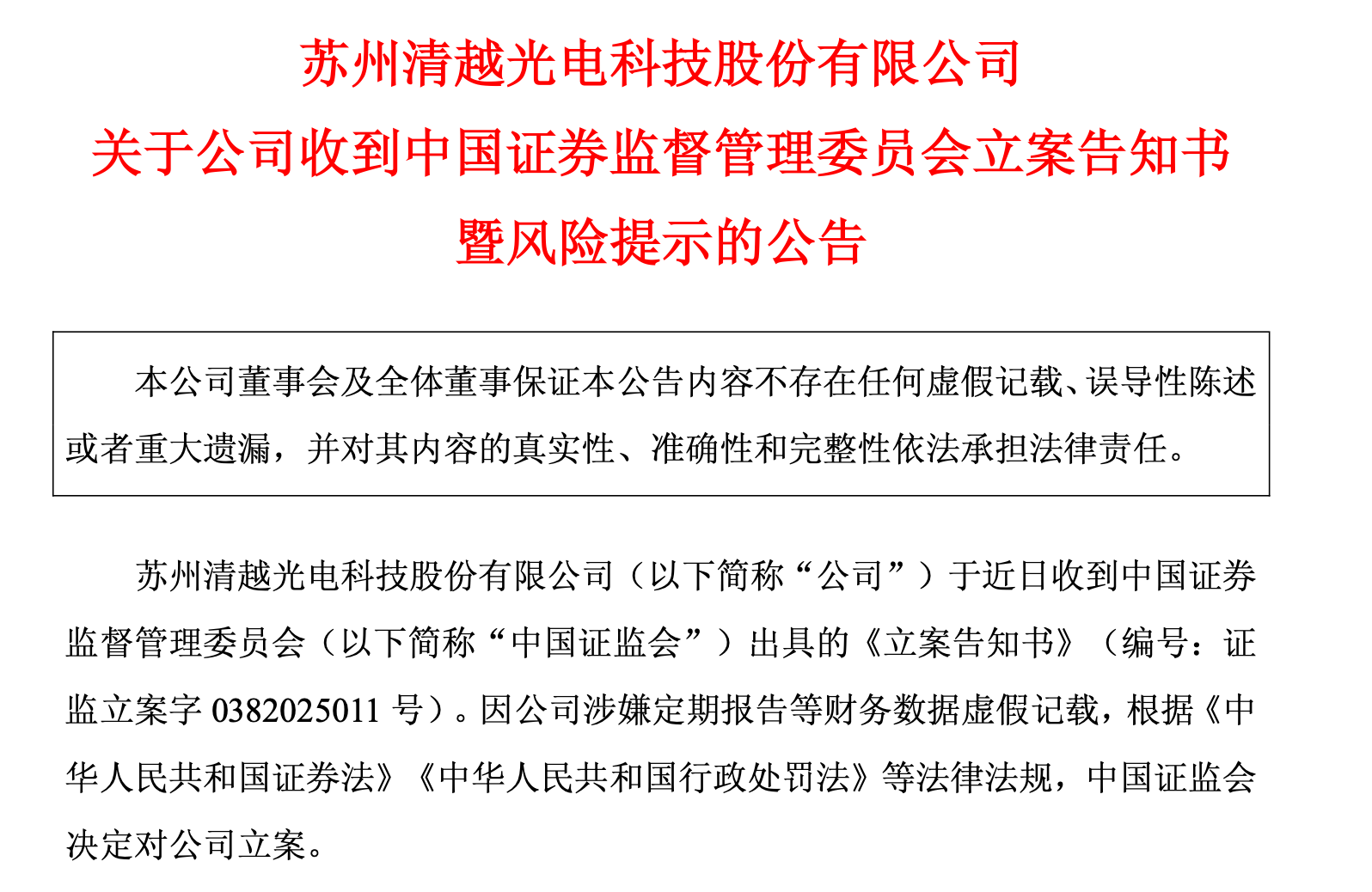 近日,苏州清越光电科技股份有限公司(以下简称“ 清越科技 ”,688496.SH)收到中国证监会出具的《立案告知书》。因涉嫌财务数据虚假记载, 清越科技 正面临证监会的严格调查,并坦言若坐实将面临强制退市。