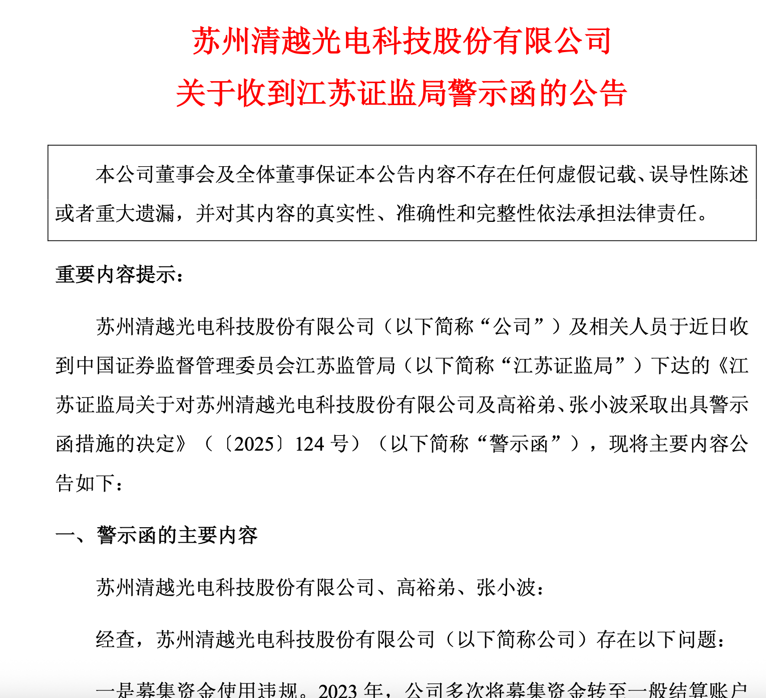 2025年8月1日, 清越科技 及相关人员收到江苏证监局下达的警示函,问题直指 清越科技 董事长高裕弟及时任 清越科技 董事会秘书兼财务总监的张小波。