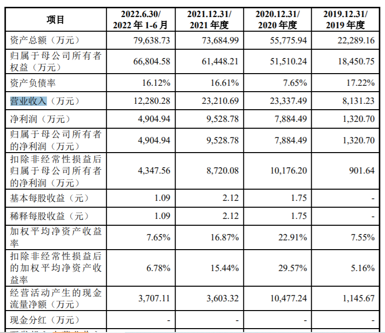 2019-2021及2022上半年,源杰科技营业收入分别为 8131.23 万元、2.33亿元、2.32亿元和 1.23亿元。同期,该公司净利润分别为1320.7万元、7884.49万元、9528.78万元、4904.94万元。