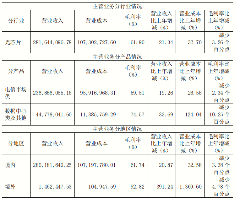 2022年,公司电信市场业务实现收入2.37亿元,较上年同期增长19.26%。主要系境内外电信运营商继续加大10G PON网络建设投入,带动公司电信市场中光纤接入板块收入增长。公司数据中心及其他业务实现收入4477.80万元,较上年同期增长33.69%。主要系25G DFB激光器芯片,经过多年研发及产品验证,逐渐得到下游客户的认可,实现批量出货,推动数据中心市场销售收入的快速增长。