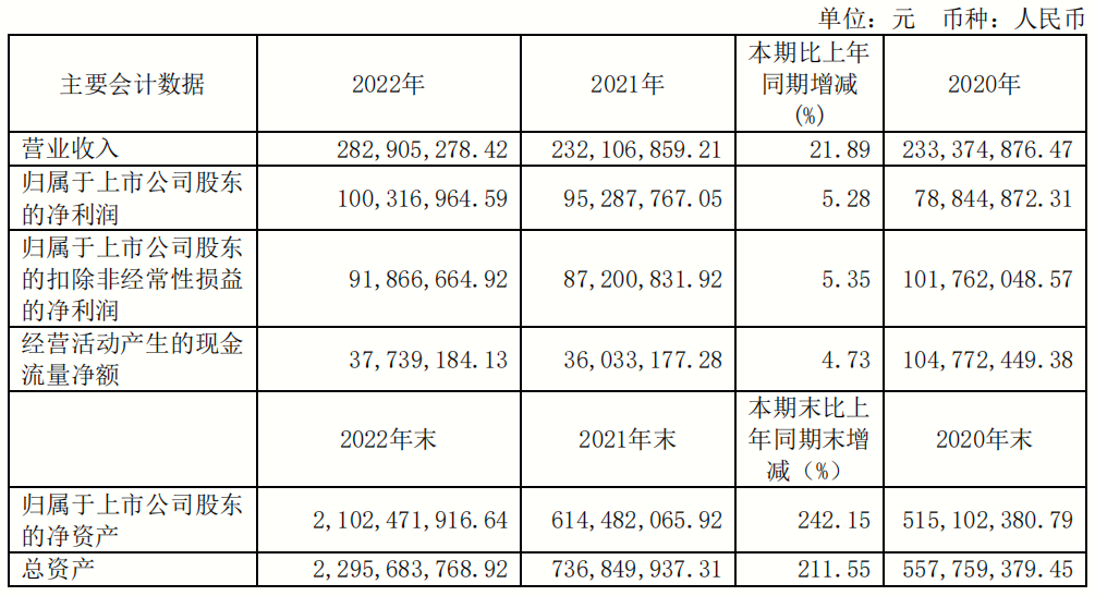 2022年,公司实现营业收入2.83亿元,较去年同期增长21.89%;实现归属于上市公司股东的净利润1.00亿元,较去年同期增长5.28%;实现归属于上市公司股东的扣除非经常性损益的净利润9186.67万元,较上年同期增长5.35%。