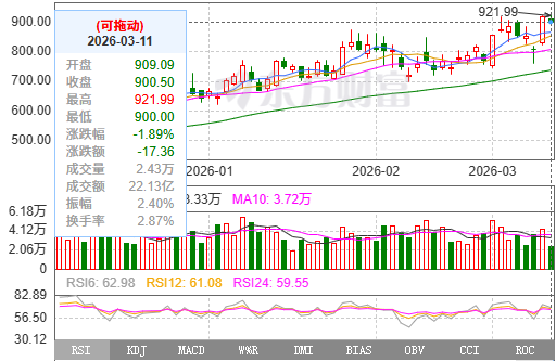 自2025年4月底行情启动以来,源杰科技股价持续走高。截至2026年3月11日收盘,公司股价已达900.50元/股,总市值突破700亿元,不到一年时间涨幅接近10倍。