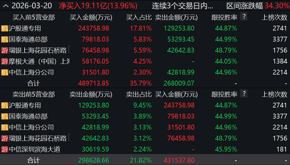 龙虎榜数据显示,3月18日至20日,源杰科技连续3个交易日内累计涨幅达到34.3%,期间上榜营业部席位合计净买入19.11亿元。具体来看,沪股通专用、国泰海通证券总部分别买入24.38亿元、7.98亿元,卖出12.93亿元、5.33亿元。