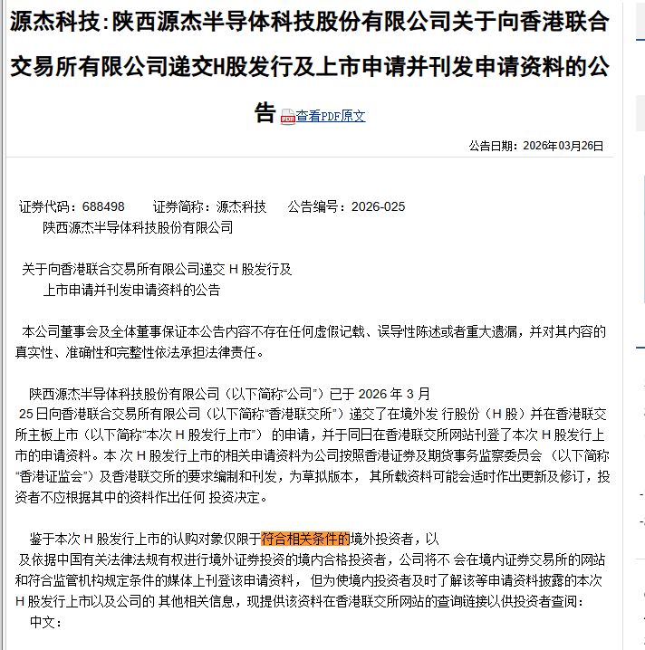 源杰科技于2026年3月25日在香港联交所网站刊登了本次H股发行上市的申请资料。根据公告,此次H股发行上市的认购对象仅限于符合相关条件的境外投资者,及有权进行境外证券投资的境内合格投资者。