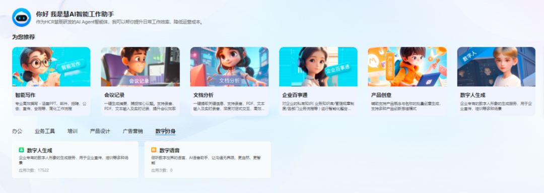 近年来,HCR慧辰股份紧跟国家“数据要素×”和“人工智能+”战略,持续关注新技术、新业态、新模式的变化和机会,致力于成为中国的“数据要素价值实现驱动器”。在AI技术新产品方向上,根据公司AIGC分析产品前期应用的反馈与企业业务智能化应用落地趋势,面对企业客户未来进行业务 AI 智能化应用建设的一体化需求(底层算力资源、自有数据资源、上层业务智能应用的统一管理运营),研发建设企业AI应用支撑解决方案,包括研发相关AI/AIGC中台化产品(算力资源运营调配系统与企业业务智能 Agent Store)和资源建设,实现对算力与数据资源有效调配以及所有 AI 智能业务应用的统一管理,对企业 AI应用的核心要素(数据、算力、应用)实现统一服务支撑。