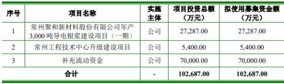 聚和材料本次公开发行募集资金总额为308,000.00万元;扣除发行费用后,募集资金净额为292,013.25万元,较原计划多189,326.25万元。聚和材料2022年12月6日发布的招股书显示,公司拟募集资金102,687.00万元,用于常州聚和新材料股份有限公司年产3,000吨导电银浆建设项目(一期)、常州工程技术中心升级建设项目、补充流动资金。