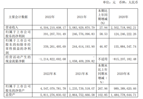 聚和材料2022年营业收入为65.04亿元,同比增长27.94%;归属于上市公司股东的净利润为3.91亿元,同比增长58.53%;归属于上市公司股东的扣除非经常性损益的净利润为3.59亿元,同比增长46.87%;经营活动产生的现金流量净额为-12.15亿元,上年同期为10.58亿元。