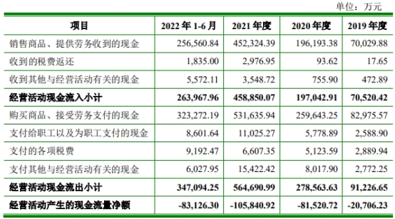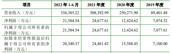 2019年至2021年及2022年1-6月,聚和材料营业收入分别为89,401.48万元、250,271.90万元、508,392.99万元、338,385.22万元;净利润分别为7,074.52万元、12,424.62万元、24,677.61万元、21,584.54万元,经营活动产生的现金流量净额分别为-20,706.23万元、-81,520.72万元、-105,840.92万元、-83,126.30万元。