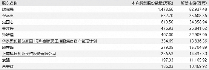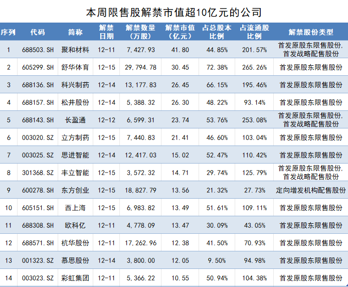 其中,解禁市值超过10亿元的公司有14家,前三分别是聚和材料(688503.SH)、舒华体育(605299.SH)、科兴制药(688136.SH)。