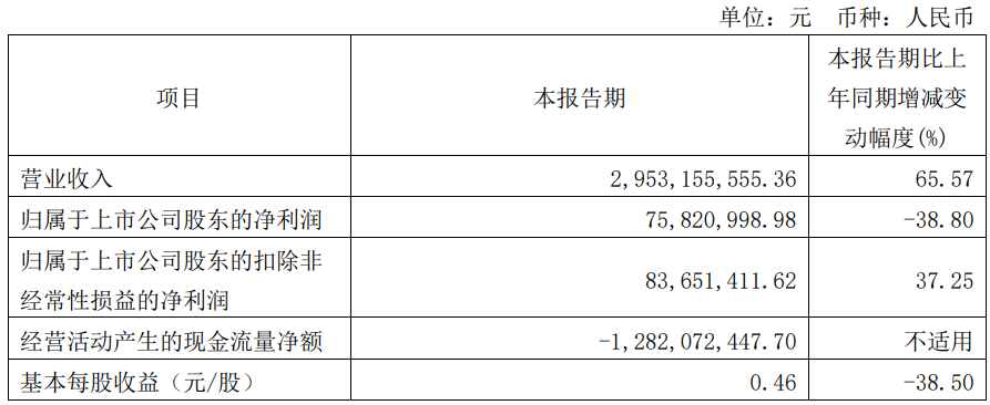 2024年第一季度,公司实现营业收入29.53亿元,同比增长65.57%;归属于上市公司股东的净利润7582.10万元,同比减少38.80%;归属于上市公司股东的扣非净利润8365.14万元,同比增长37.25%;经营活动产生的现金流量净额-12.82亿元。