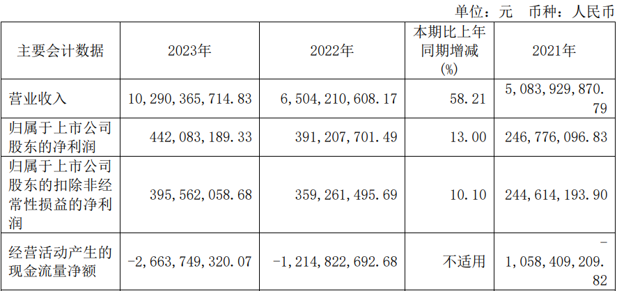 2023年,聚和材料实现营业收入102.90亿元,同比增长58.21%;归属于上市公司股东的净利润4.42亿元,同比增长13.00%;归属于上市公司股东的扣非净利润3.96亿元,同比增长10.10%;经营活动产生的现金流量净额为-26.64亿元,上年同期为-12.15亿元。