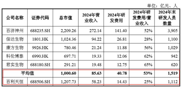 而在2024年,包括百济神州、信达生物在内的5家可比公司此项数据的平均值分别为53%,百利天恒明显落后于行业。