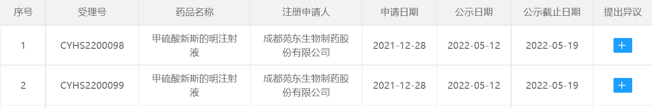 今日,CDE官网显示,苑东生物甲硫酸新斯的明注射液获优先审评资格。