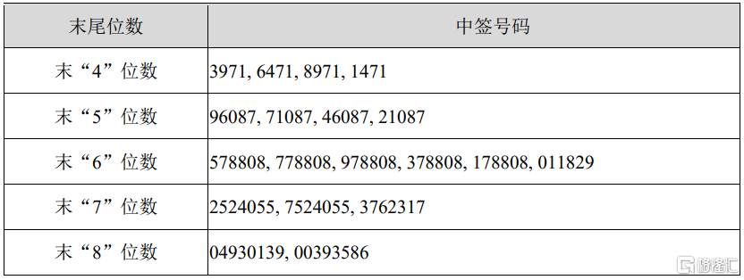 凡参与网上发行申购裕太微电子股份有限公司A股股票的投资者持有的申购配号尾数与上述号码相同的,则为中签号码。中签号码共有1.147万个,每个中签号码只能认购500股裕太微A股股票。