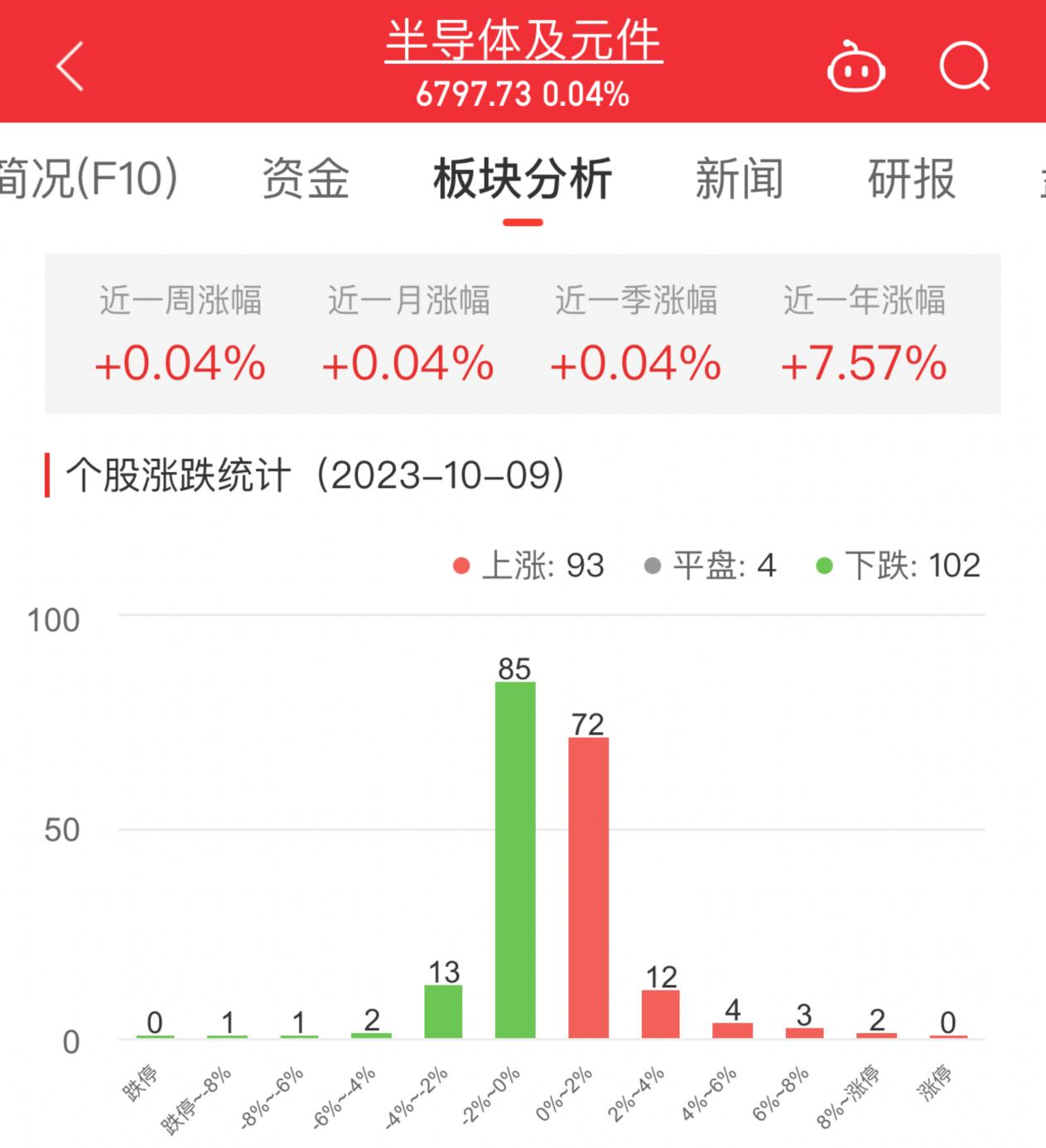 今日,半导体及元件板块整体涨幅0.04%,其中93只股票上涨,4只股票平盘,102只股票下跌。