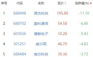 源杰科技、盛科通信、博敏电子、威尔高、南芯科技位列涨幅榜后五位,涨幅分别为-11.10%、-6.86%、-5.43%、-4.83%、-3.72%。