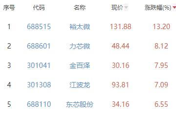其中,裕太微、力芯微、金百泽、江波龙、东芯股份位列板块涨幅前五位,涨幅分别为13.20%、8.12%、7.95%、7.09%、6.55%。