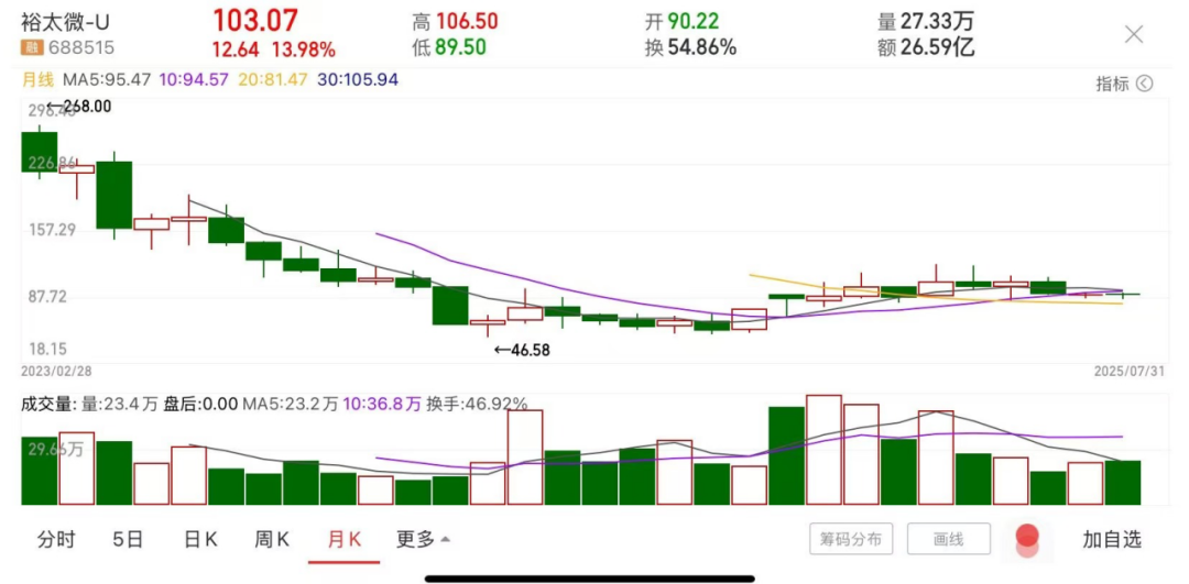 另外,裕太微二级市场表现也堪忧,该公司发行价为92元/股,2023年上市时股价一度涨至268元/股。随后,该公司股价震荡走低,截至今日收盘报103.07元/股,较历史高价已腰斩,总市值为82.46亿元。