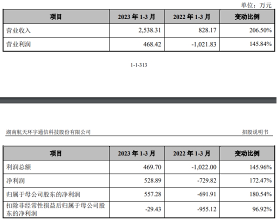 2023年1-3月,公司实现营业收入2,538.31万元,较上年同期增长206.50%;净利润、归属于母公司股东的净利润、扣除非经常性损益后归属于母公司股东的净利润分别为528.89万元、557.28万元、-29.43万元,分别较上年同期增长172.47%、180.54%、96.92%;经营活动产生的现金流量净额为-8,511.76万元,上年同期为-7,297.83万元。