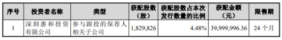 财信证券相关子公司深圳惠和投资有限公司的实际跟投比例为本次公开发行数量的4.48%,即182.9826万股,跟投金额为39,999,996.36元,跟投获配股票限售期限为自公司首次公开发行并上市之日起24个月。