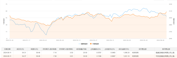 佰维存储6月11日大宗交易成交50万股,成交额2717.3万元,占当日总成交额的1.43%,成交均价54.35元,较市场收盘价58.46元折价7.03%,其中最高成交价54.37元,最低成交价54.31元。