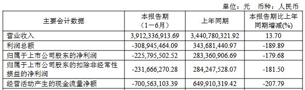 2025年1-6月,公司实现营业收入39.12亿元,同比增长13.70%;归属于上市公司股东的净利润为-2.26亿元,上年同期为2.83亿元;归属于上市公司股东的扣除非经常性损益的净利润为-2.32亿元,上年同期为2.84亿元;经营活动产生的现金流量净额为-7.01亿元,上年同期为6.50亿元。