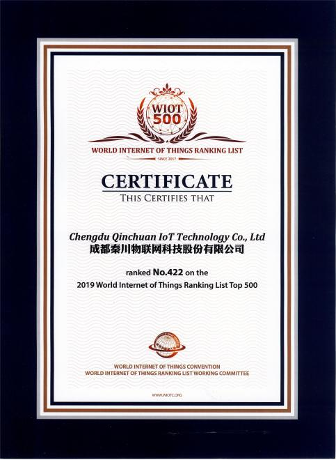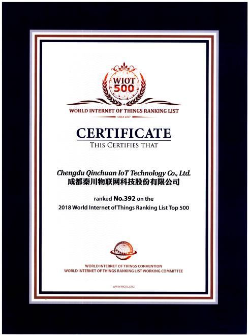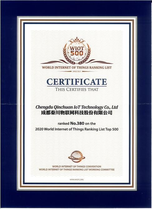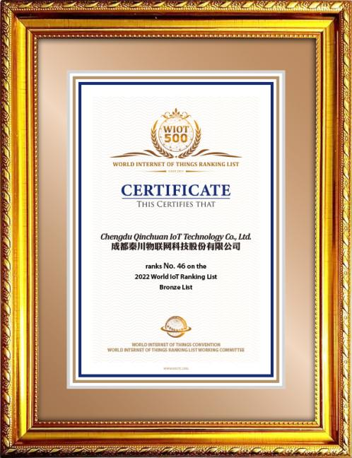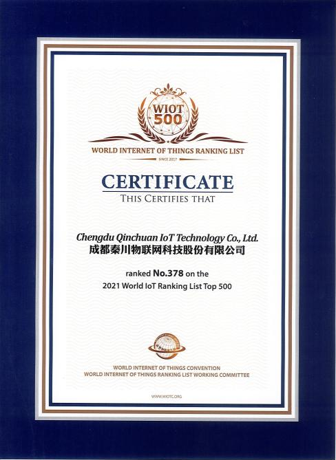 目前,秦川物联网已经连续6年荣登世界物联网500强排行榜,在2018年、2019年、2020年、2021年、2022年的榜单中分别为第392位、422位、380位、378位和346位。