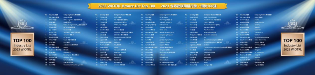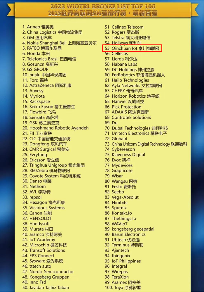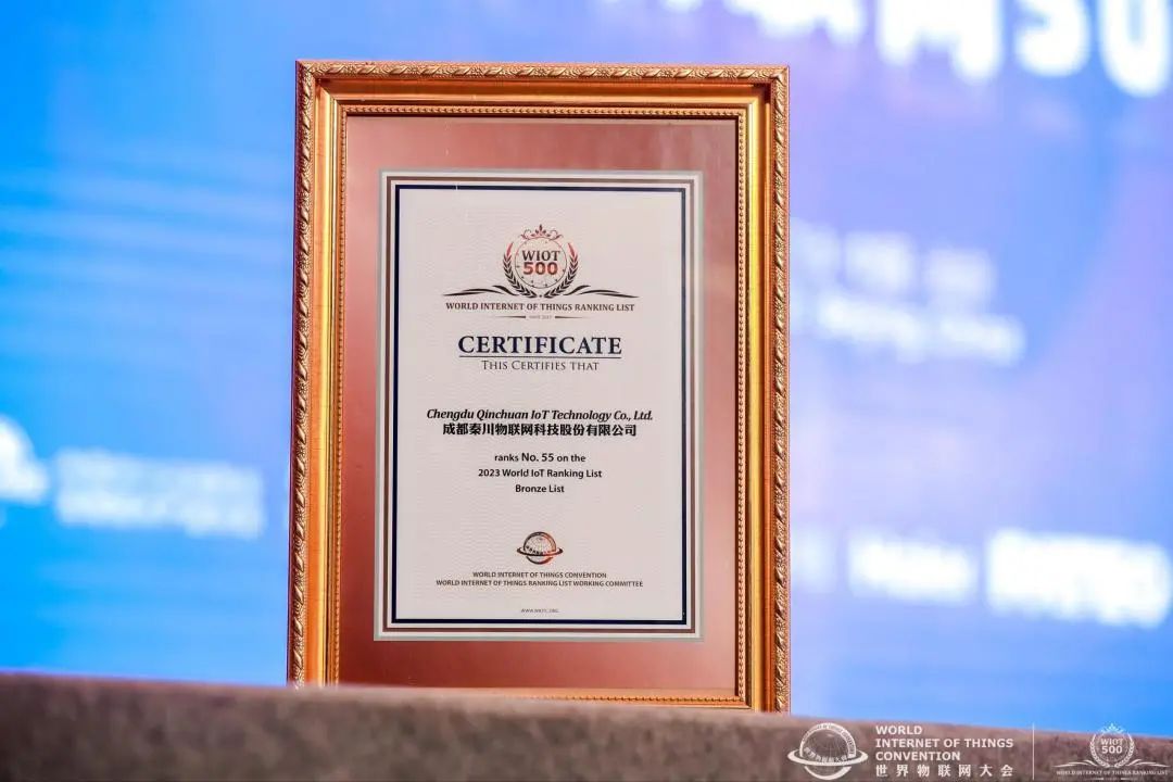 成都秦川物联网科技股份有限公司(以下简称“秦川物联网”)荣登2023世界物联网500强排行榜·铜榜100强,位列第55位。