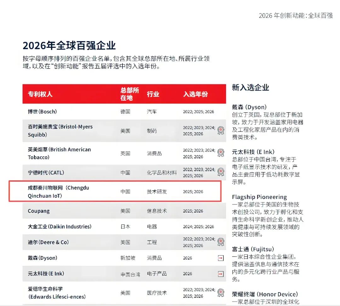 秦川物联荣登“2026年创新动能:全球百强”