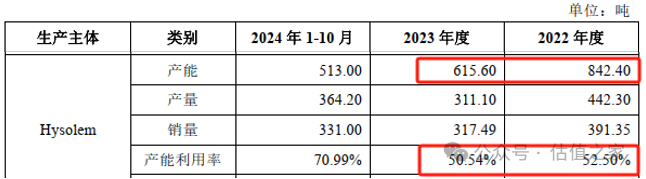 对此,上市公司则表示,2022年-2023年标的公司毛利率较低系受韩国子公司低毛利率拖累影响,而其报告期内毛利率水平的提升则得益于母公司和韩国子公司产能利用率的提升。但此番解释的合理性,就估值之家看来显然并不充分。一方面,从产能占比来看,2022年标的公司的韩国子公司Hysolem的产能仅为842.40吨,占公司整体产能的比例也仅有6.27%,其是否对于公司整体的毛利率水平有较大影响依然存疑。