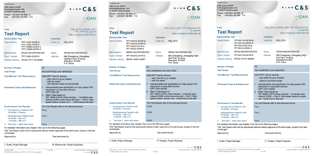 目前,车企根据车身架构的需求设计整车的CAN网络,各电子零部件通过CAN收发器接入对应的CAN网络。由于电子零部件可能来自不同的Tier 1,使用的CAN收发器的品牌不尽相同,所以对于CAN收发器的兼容性提出了高要求。思瑞浦全系列汽车级CAN产品均能提供德国C S实验室提供的兼容性报告,可直接和其他通过C S认证的CAN收发器无障碍通信。