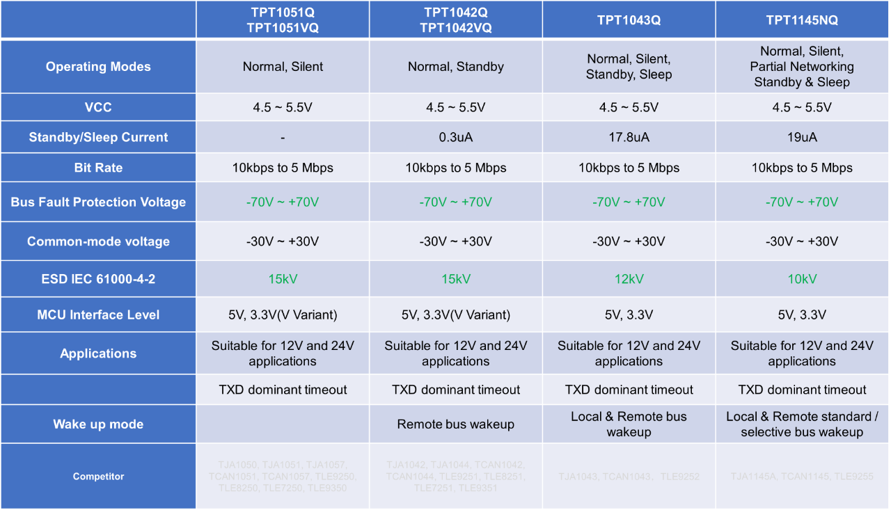 TPT1051Q、TPT1042Q、TPT1043Q和TPT1145Q 均已量产,具备诸多亮点: