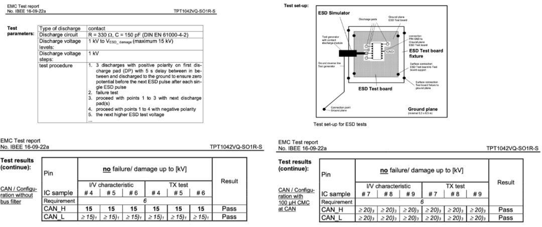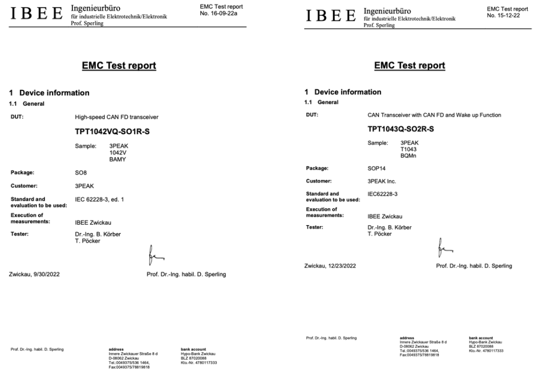思瑞浦全系列汽车级CAN产品均能出具C S兼容性报告和IBEE出具的EMC和ESD报告。