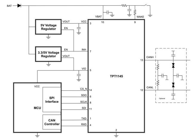 TPT1145Q在Standby与Sleep状态下均能保持极低功耗,同时也可以通过INH管脚控制ECU模块的电源系统。如下图所示,仅在收到特定帧格式的唤醒指令后才精确唤醒响应的ECU模块,从而避免整个CAN网络频繁的唤醒休眠产生的额外功耗,帮助TPT1145Q成为控制ECU节点功耗的利器,应用在整车中则能增加新能源汽车续航里程、降低传统汽车碳排放。
