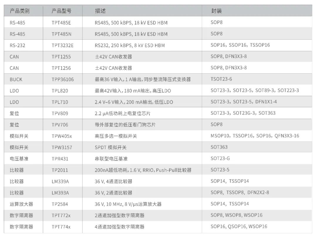 应用于电表电力市场RS485收发器TPT485x,提供4.5V-5.5V供电范围,同时具备真正的“Fail-Safe”功能,为内部高可信电路设计提供保障;产品拥有热插拔功能和高ESD保护能力,可提升系统可靠性和鲁棒性;支持256节点组网;强劲的产品性能,可实现TPT485x与业界主流型号Pin-to-Pin兼容。
