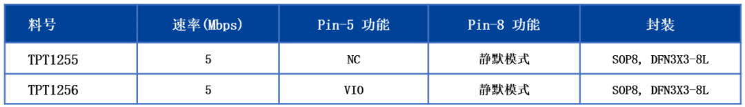 加强型工业级5V CAN收发器TPT1255-TPT1256,5Mbps CAN FD,具备高共模、高耐压、高ESD防护等级的特性,4.5V-5.5V VCC输入电压范围,支持3.3V~5V VIO,满足多种工业和通讯应用场景。