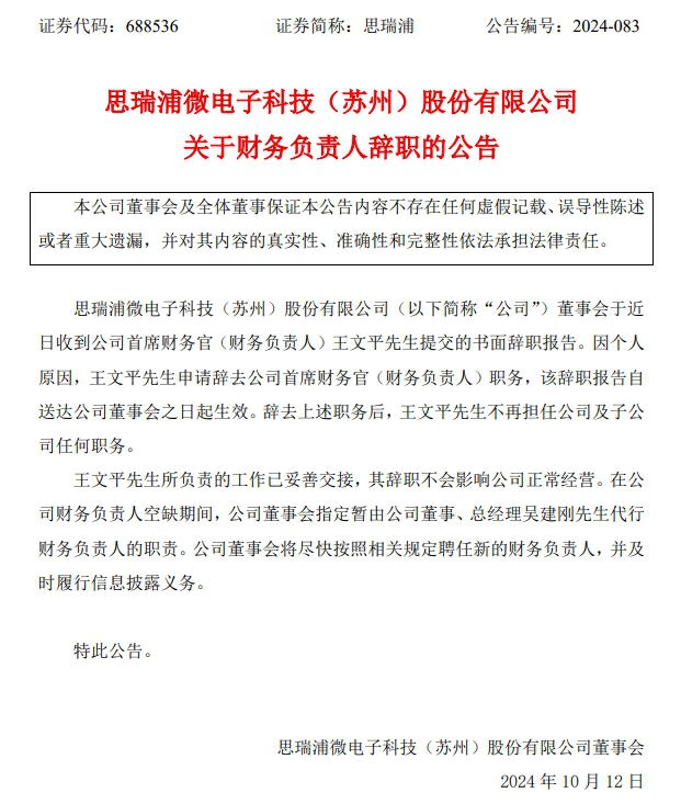 10月11日晚间,思瑞浦(688536)公告,公司董事会于近日收到公司首席财务官(财务负责人)王文平提交的书面辞职报告。因个人原因,王文平申请辞去公司首席财务官(财务负责人)职务,该辞职报告自送达公司董事会之日起生效。辞去上述职务后,王文平先生不再担任公司及子公司任何职务。
