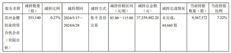 6月28日,公司收到金樱创投发来的《关于股份减持结果的告知函》,在本次减持计划期间,金樱创投通过集中竞价方式累计减持公司股份35.31万股,占公司当前总股本的0.27%。
