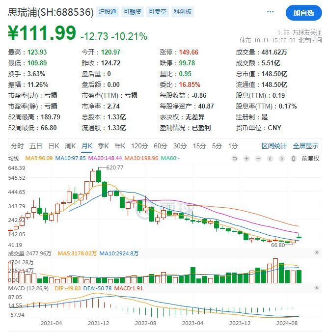 自上市之后,思瑞浦便受到投资者追捧,其股票发行价为115.71元/股,至2021年12月,一度超620元/股。但此后,思瑞浦的股价开始一路走跌,截至10月11日收盘,报111.99元/股,总市值148.50亿元。
