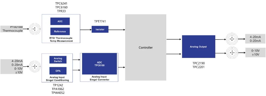 DCS/PLC模拟量输入/温度测量,TPC6160内置可编程增益PGA,通过多路复用器(MUX)测量双路差分或四路单端输入,可灵活配置,用于测量温度,和4mA~20mA、±10V等模拟量输入信号。