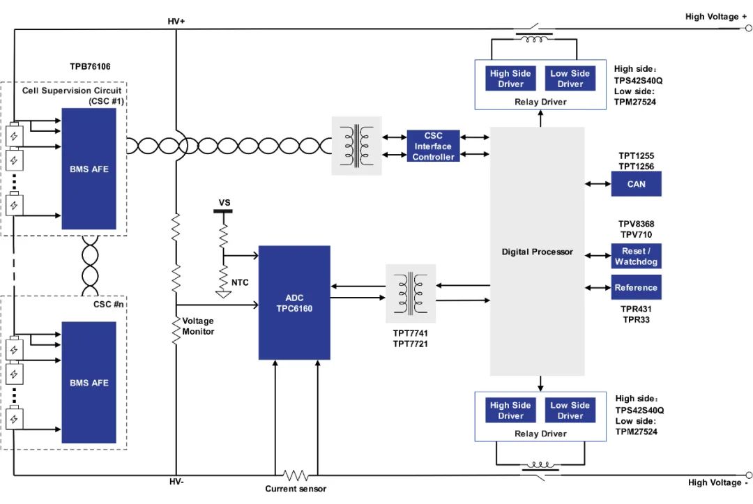 TPC6160可用于储能BMS中总电压、总电流、温度、绝缘阻抗等测量和监控。TPC6160共有4个输入通道,内部集成PGA,便于测量电池组总电压、NTC温度、高压链路电压、机箱绝缘阻抗等。TPC6160较低的失调误差、增益误差以及噪声,配合外部高精度采样电阻,可精准检测电池包总电流。