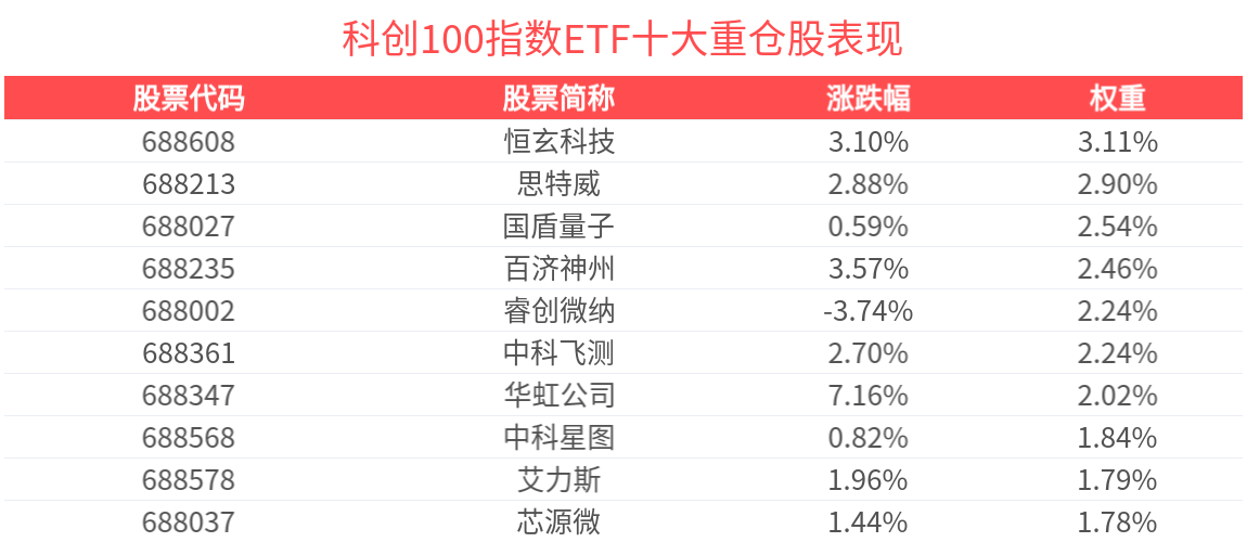 数据显示,截至2025年3月31日,上证科创板100指数(000698)前十大权重股分别为恒玄科技(688608)、百济神州(688235)、睿创微纳(688002)、翱捷科技(688220)、泽璟制药(688266)、绿的谐波(688017)、铂力特(688333)、芯源微(688037)、国盾量子(688027)、乐鑫科技(688018),前十大权重股合计占比23.76%。