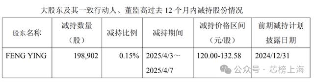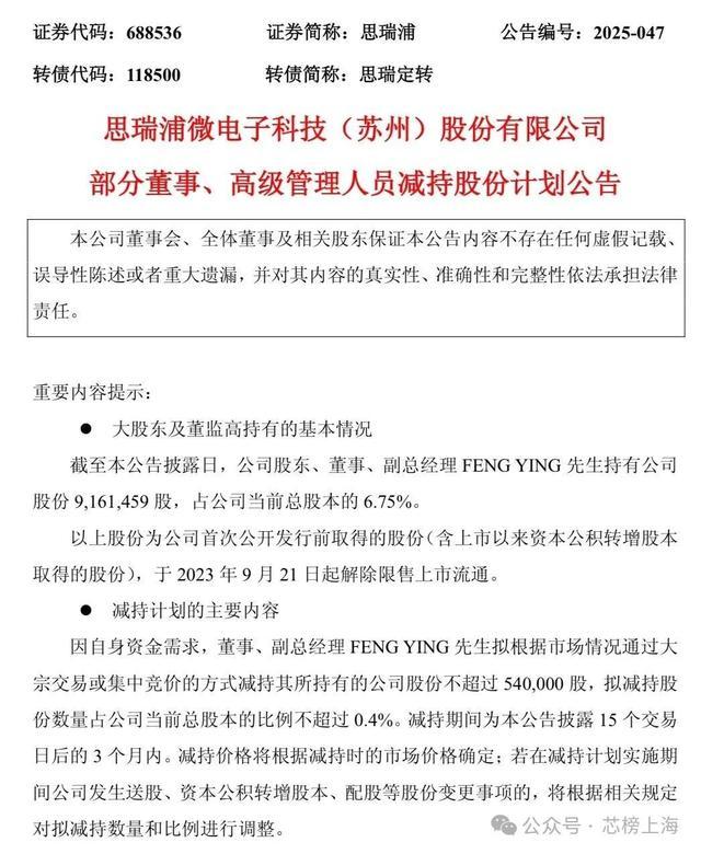 思瑞浦(688536)深夜炸锅!董事兼副总经理 FENG YING 抛出重磅减持计划,拟 3 个月内狂抛不超 54 万股,占总股本 0.4%,减持规模堪称年内新高!