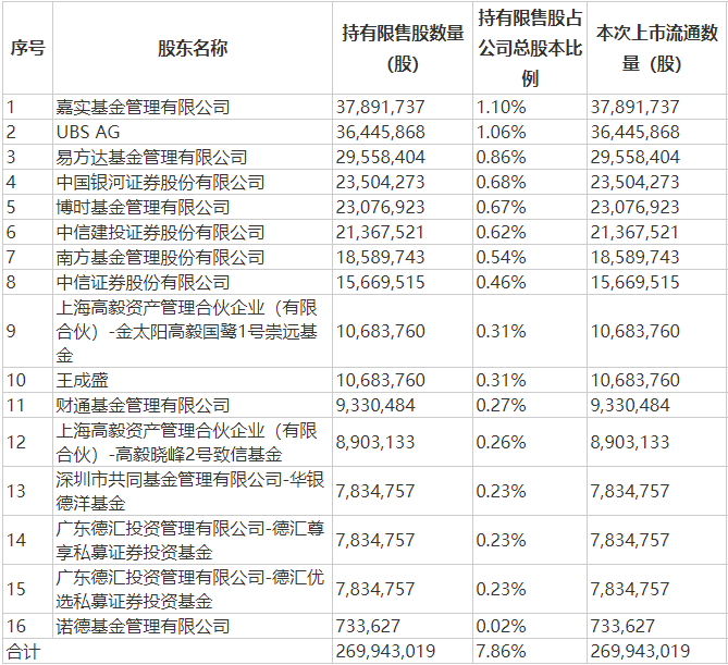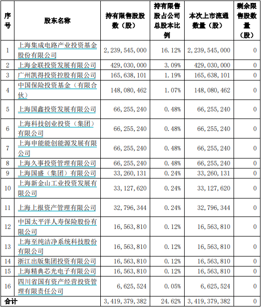和辉光电本次限售股解禁明细