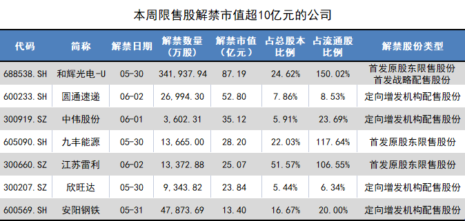 整体来看,解禁数量超过1亿股的公司有6家,和辉光电-U、安阳钢铁(600569.SH)、圆通速递、九丰能源(605090.SH)、江苏雷利(300660.SZ)、陕西建工(600248.SH)。