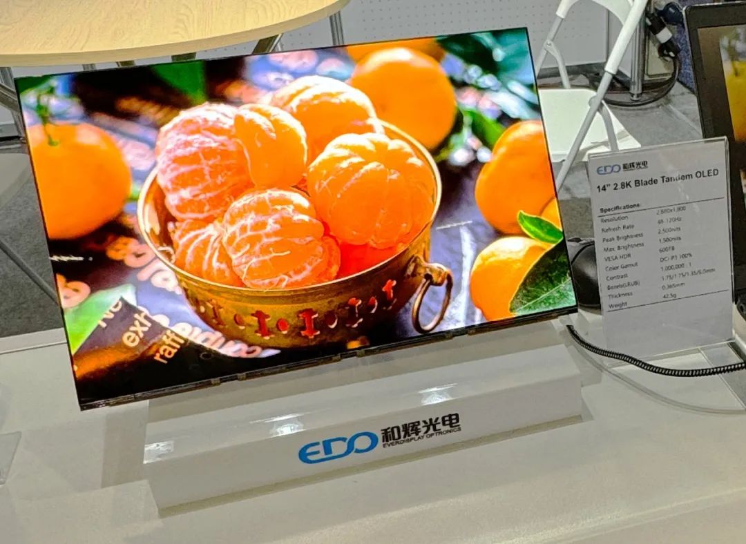 和辉光电14寸2.8K刀锋+叠层OLED屏,采用业内最先进的超薄玻璃搭配薄膜封装技术,产品厚度降低60%,重量降低60%,并可达到传统OLED产品相同的强度规格。同时,采用和辉光电自主叠层OLED技术,产品全屏亮度可达1500Nits,峰值亮度超过7000Nits。