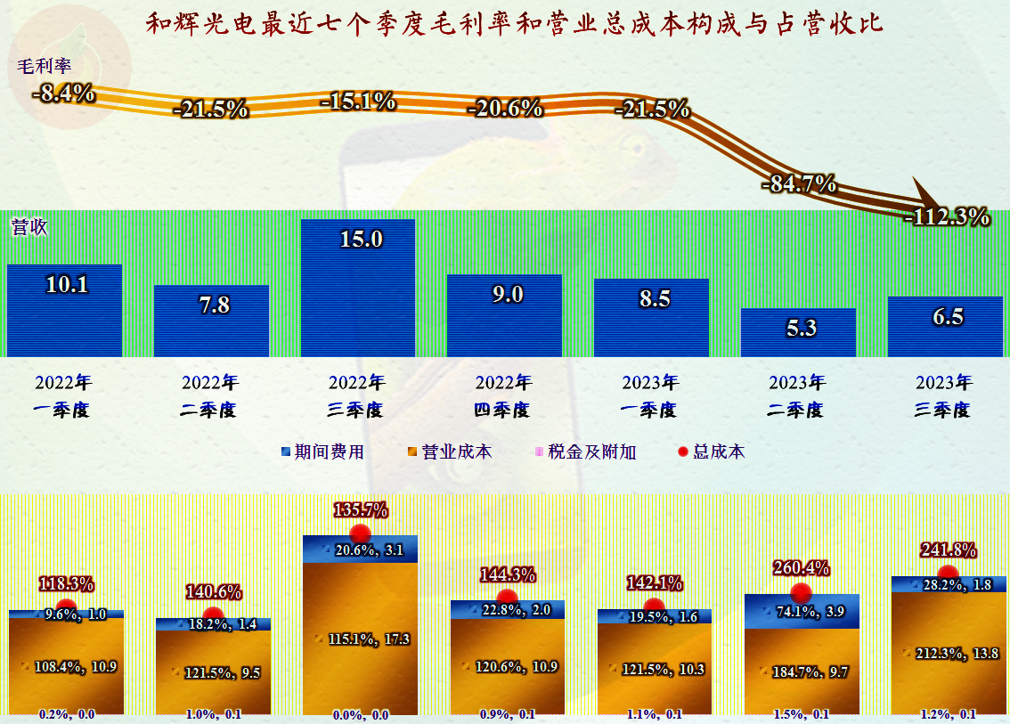 和辉光电的毛利率从未为正数,也就是毛利方面都全是亏损,2023年的毛利率达到了夸张的-67.2%,也就是,仅其成本是营收的1.67倍。销售净利率超过-100%,也就是产生一元的收入,就得花掉两元多的成本费用。