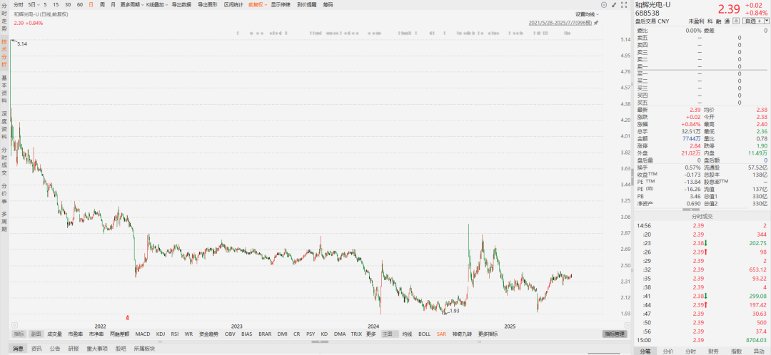从股价看,和辉光电可以说上市即巅峰,21年5月28日创下5.14元的最高价后,便一路震荡下行,近两三年股价绝大部分时间在3元以下徘徊。
