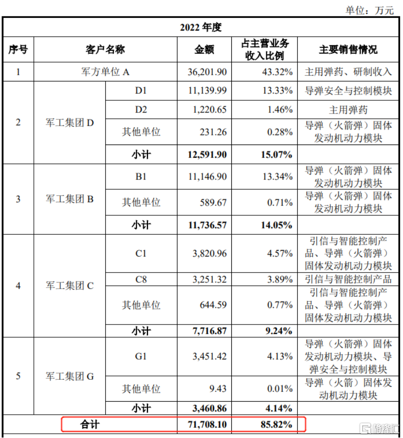 值得注意的是,公司存在客户集中度较高的风险。报告期内,公司向前五大客户销售金额占主营业务收入的合计比例均超过80%,其中对第一大客户军方单位A的销售收入占比分别为53.29%、51.35%和43.32%;向军工集团B下属B1单位的销售收入占比分别为10.56%、8.50%和13.34%。