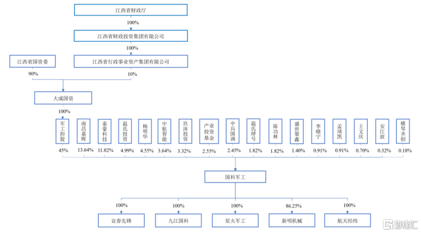 截至发行前,公司的控股股东为军工控股,间接控股股东为大成国资,实际控制人为江西省国资委。其中,军工控股直接持有45%股份,大成国资持有军工控股100%股权。